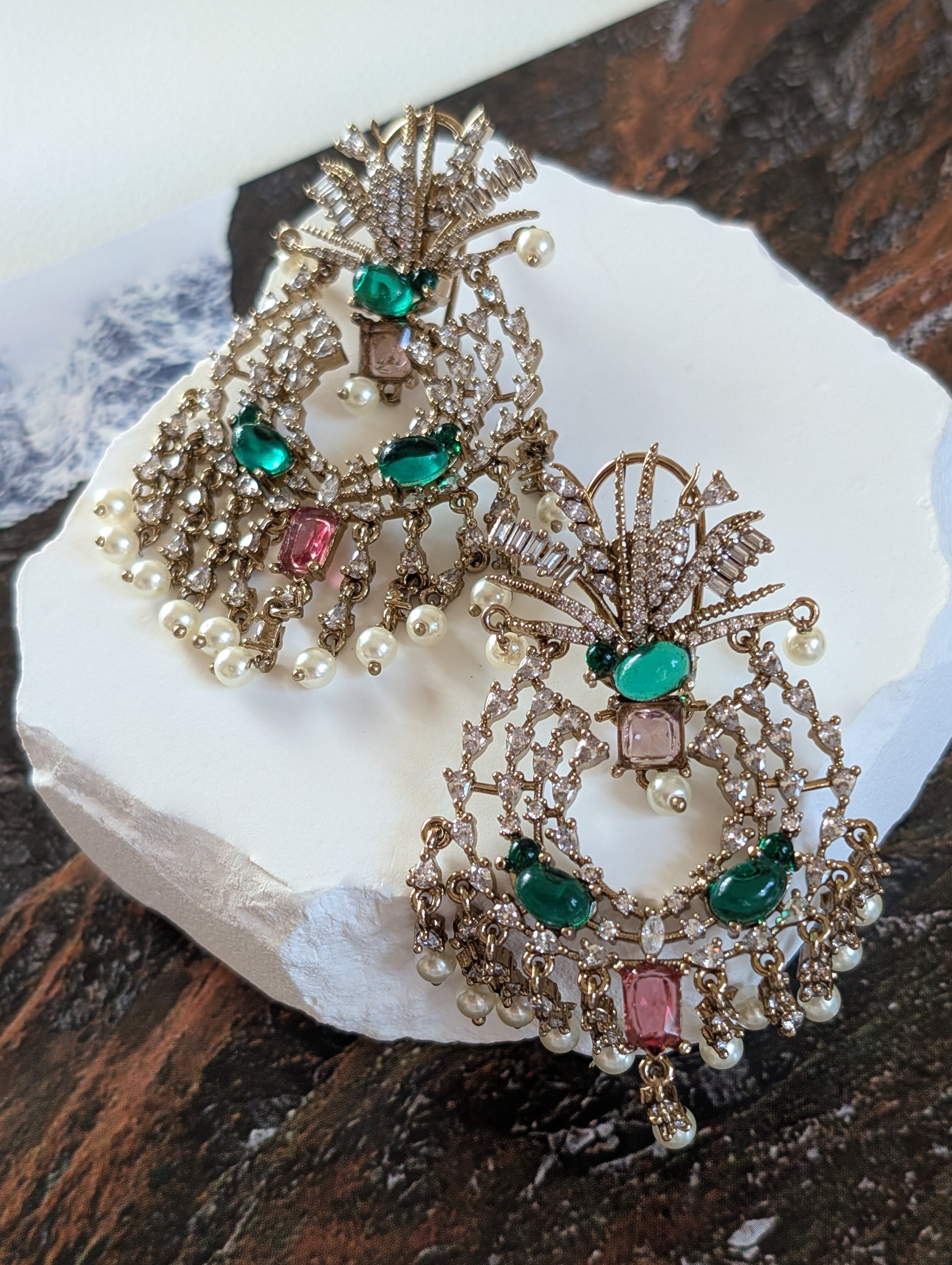 A tribute to the grandeur of royal heirlooms, these exquisite chandelier earrings radiate vintage opulence with a contemporary touch. They feature a mesmerizing arrangement of rich green emeralds, sparkling diamonds, lustrous pearls, and delicate blush-toned gemstones, creating an intricate dance of light and color. The cascading design, reminiscent of regal chandeliers, offers an air of timeless elegance, perfect for those who love to make an entrance. Whether styled with an evening gown for a glamorous affair or paired with a sleek ensemble for a modern twist, these earrings are the ultimate statement of refined luxury and sophistication.