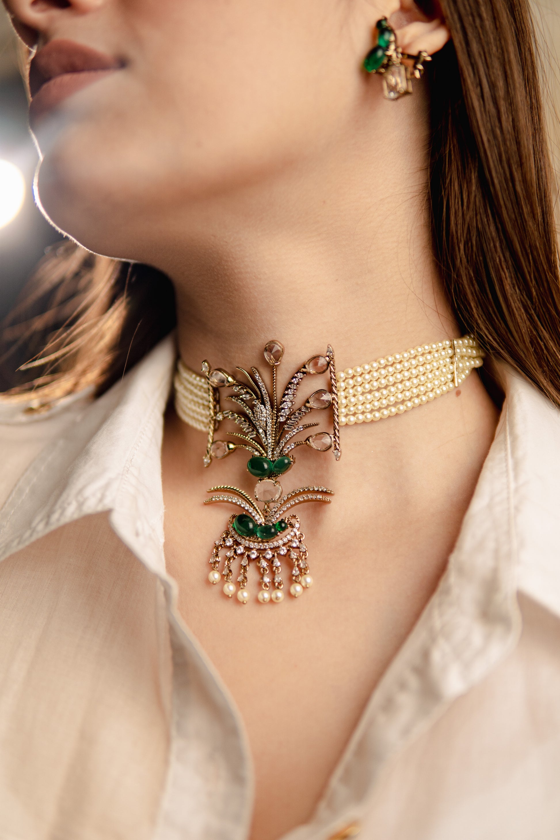 This majestic choker transforms heritage into wearable art. Set on a wide band of clustered pearls, it features an ornate, palm-inspired motif detailed with emerald-toned stones, polki-style gems, and delicate pearl danglings. It's a nod to royal insignias of ancient courts, making it the perfect accessory for anyone who wants to wear culture with confidence and drama.