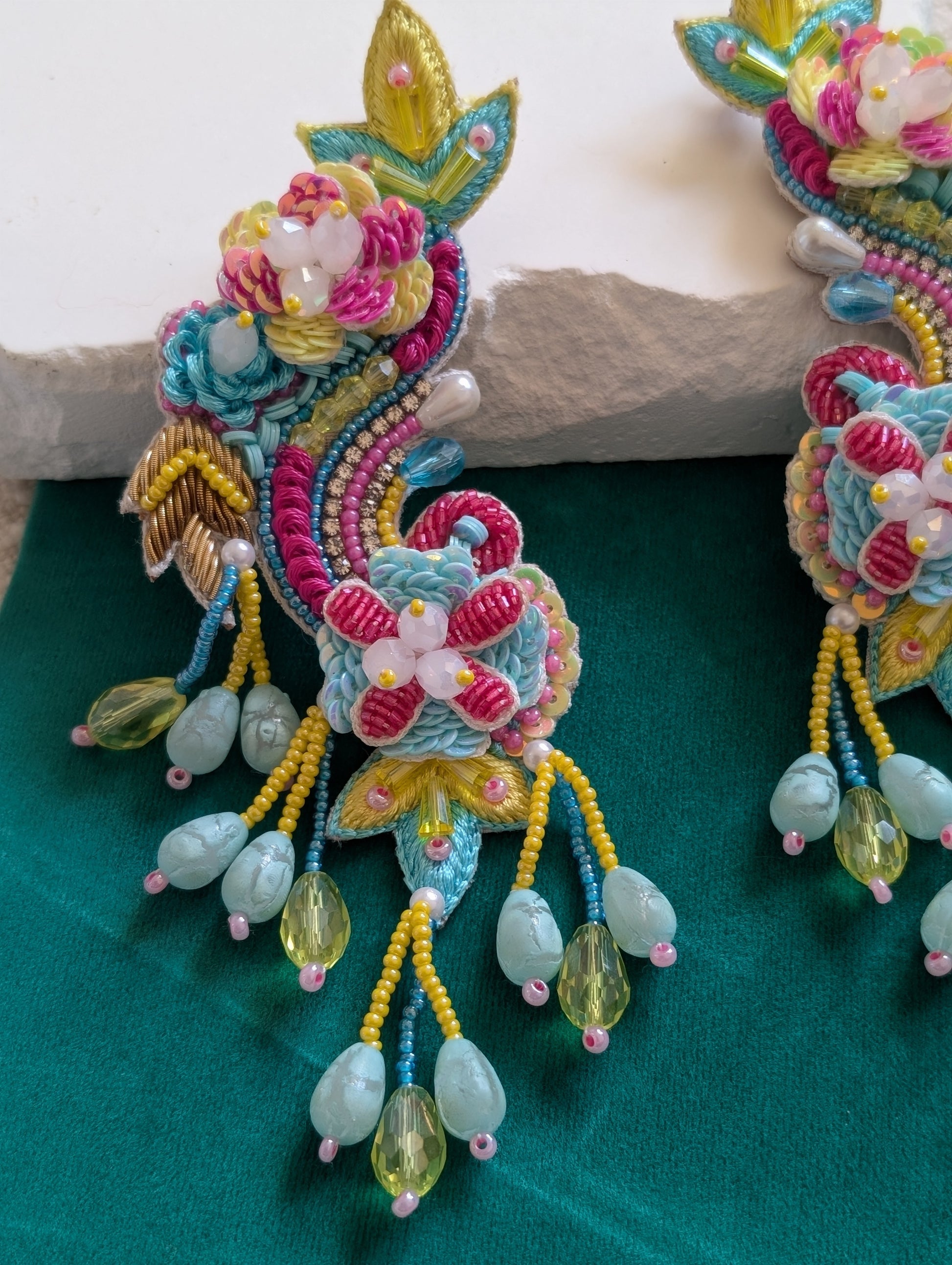 Bold, bright, and unapologetically expressive, the Tara Threadsong Drops weave together color and character in a celebration of handcrafted artistry. Each earring begins with a blooming thread-and-bead floral motif, unfolding into cascades of woven hues—fuchsia, teal, goldenrod, and forest green—stitched into rhythmic layers. Accented with delicate white beads and finished with playful tassel-style danglers, these earrings shimmer with joyful movement and cultural flair. Lightweight and radiant, they're a wearable tapestry of tradition and modern whimsy.