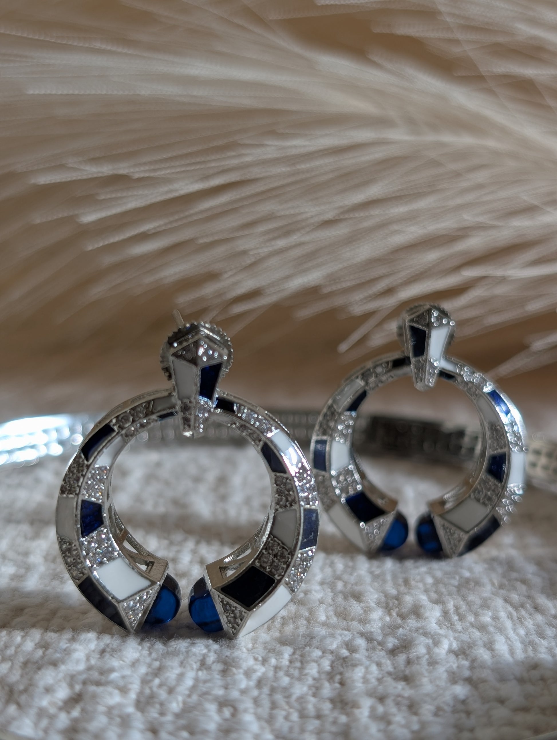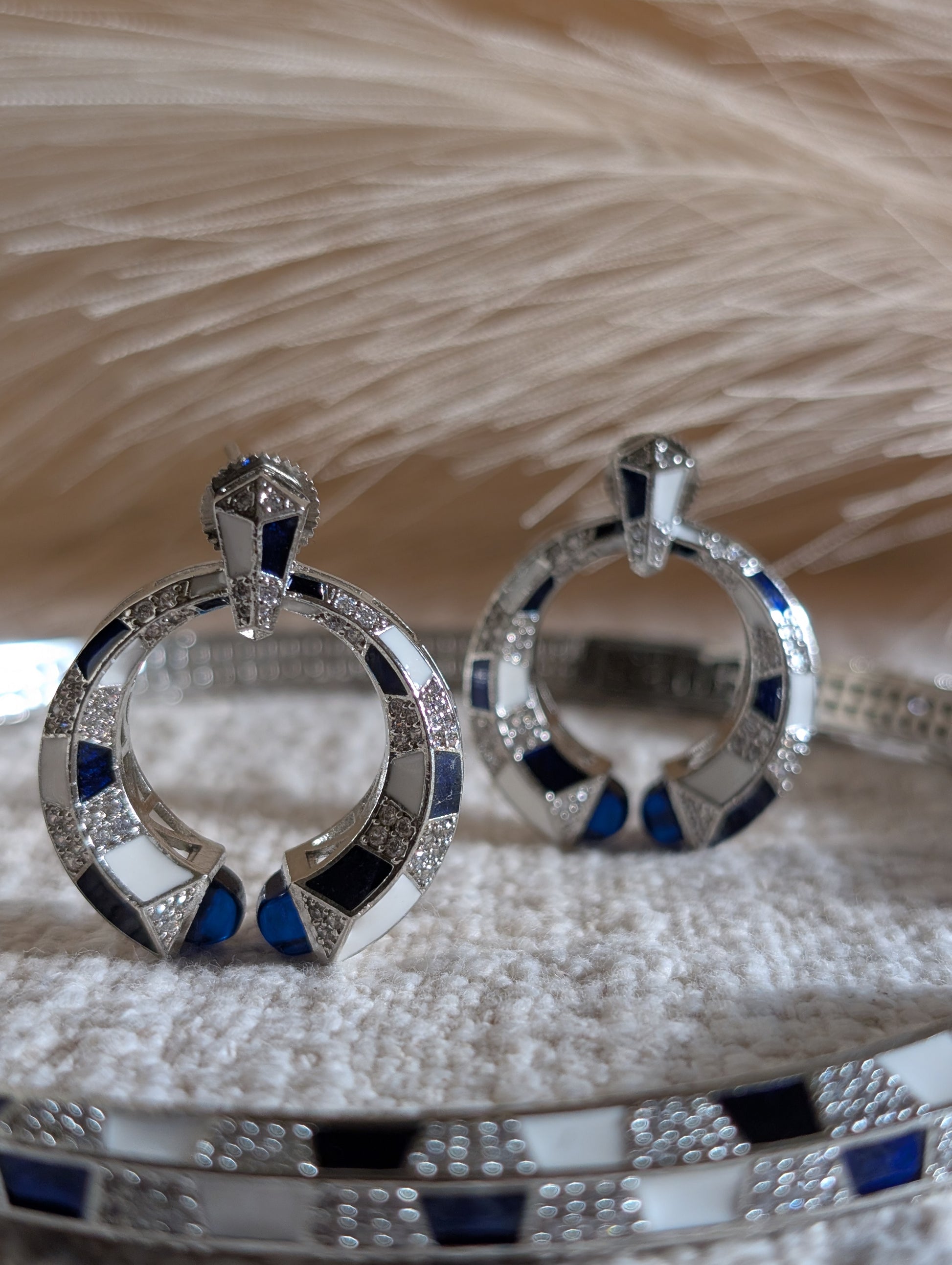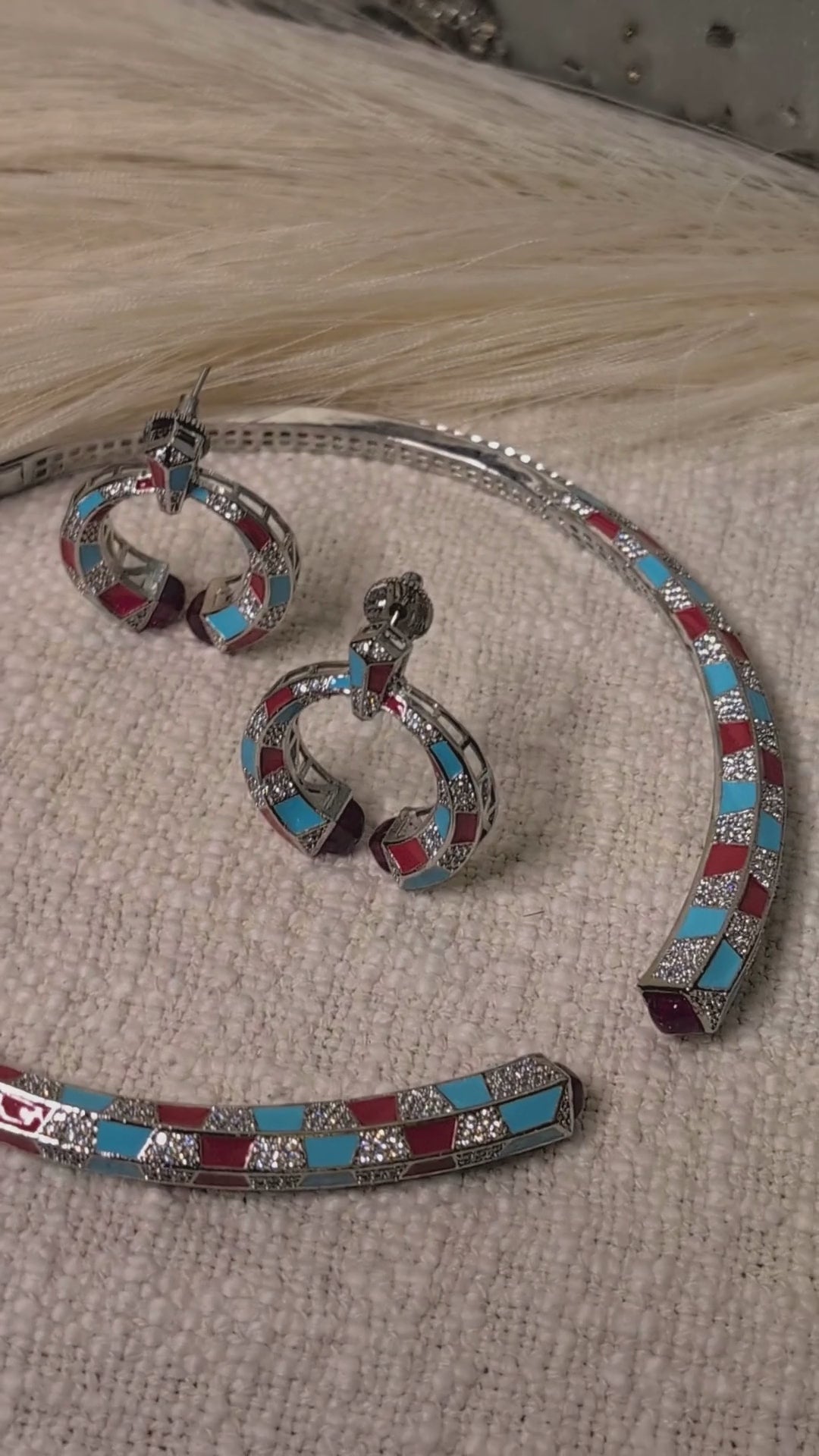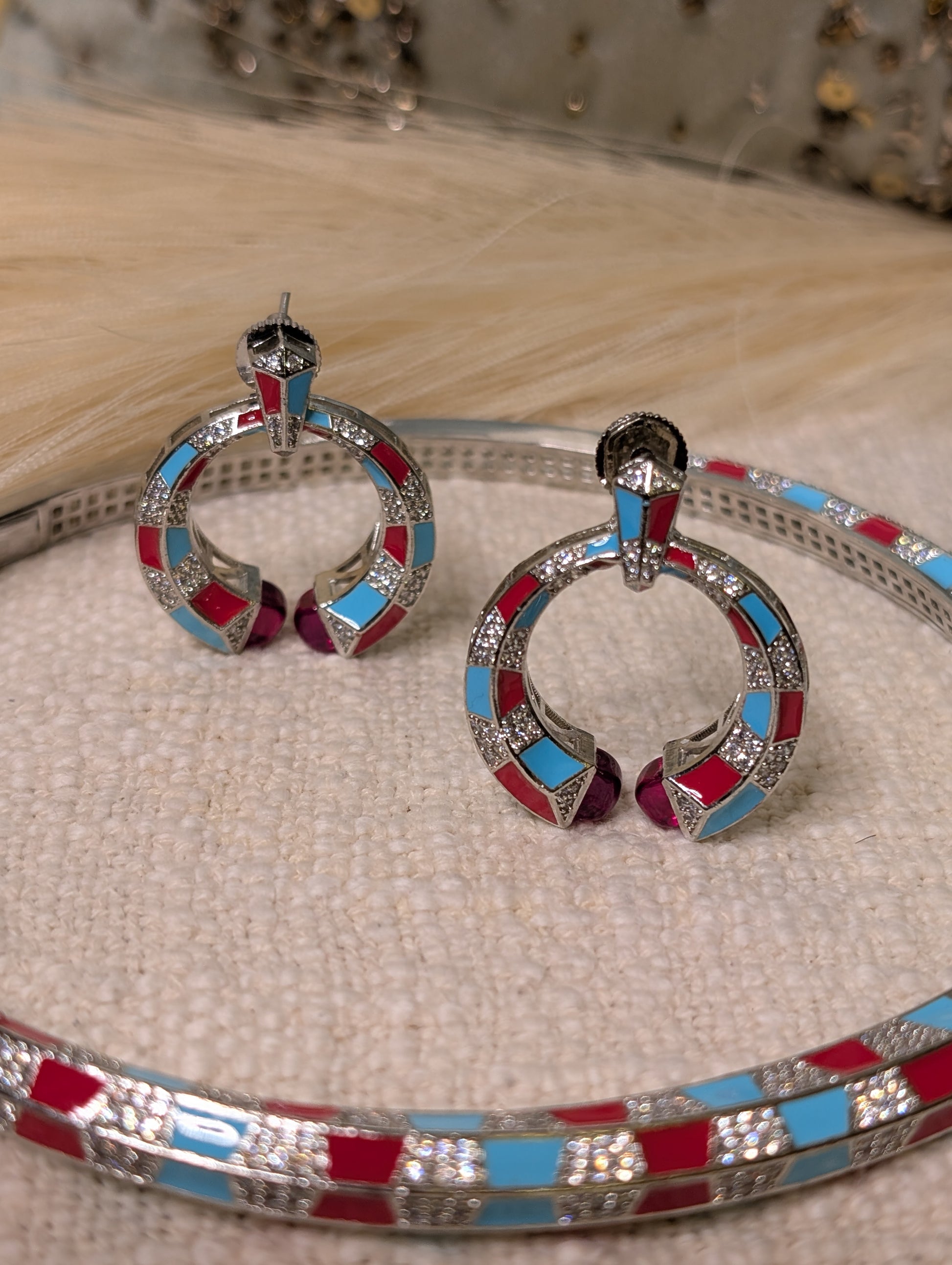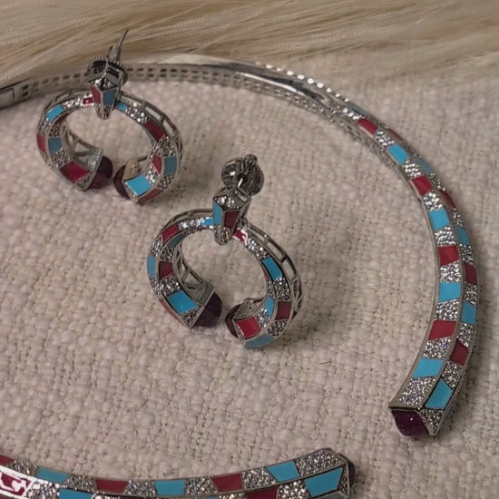Step into the vibrant charm of the Venetian Mosaic Necklace Set, a stunning creation that fuses modern design with timeless elegance. Featuring a beautifully crafted necklace and matching hoop earrings, this set showcases a vibrant checkerboard of red and blue enamel complemented by sparkling crystals. Its playful yet refined design makes it a versatile choice for a casual day out or a chic evening event. Let this set bring a bold splash of color and sophistication to your jewelry collection, effortlessly turning heads wherever you go.