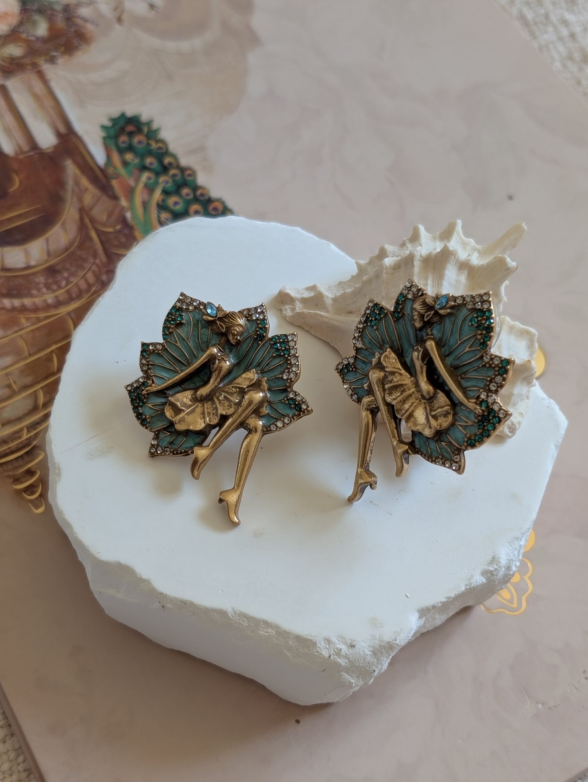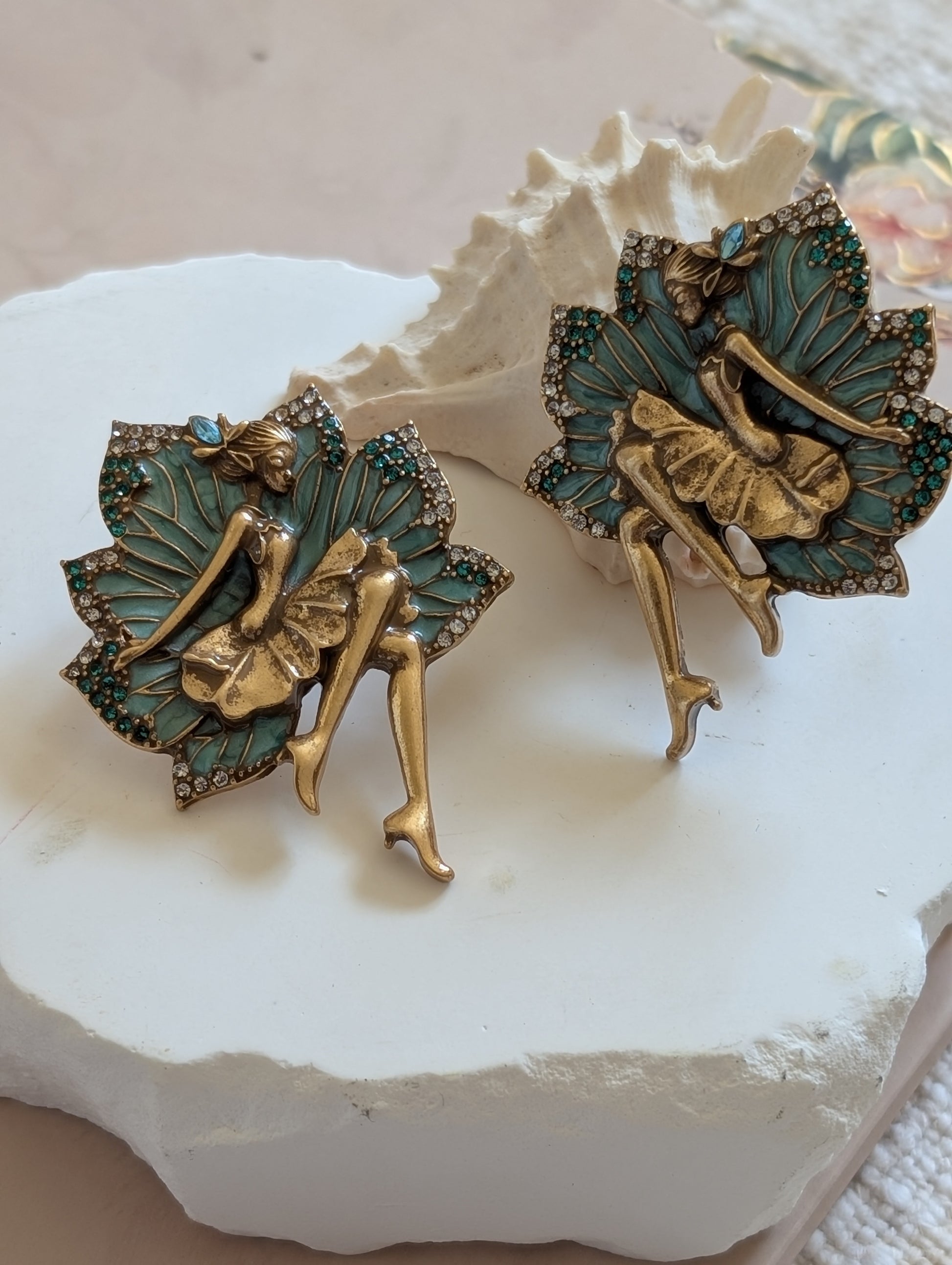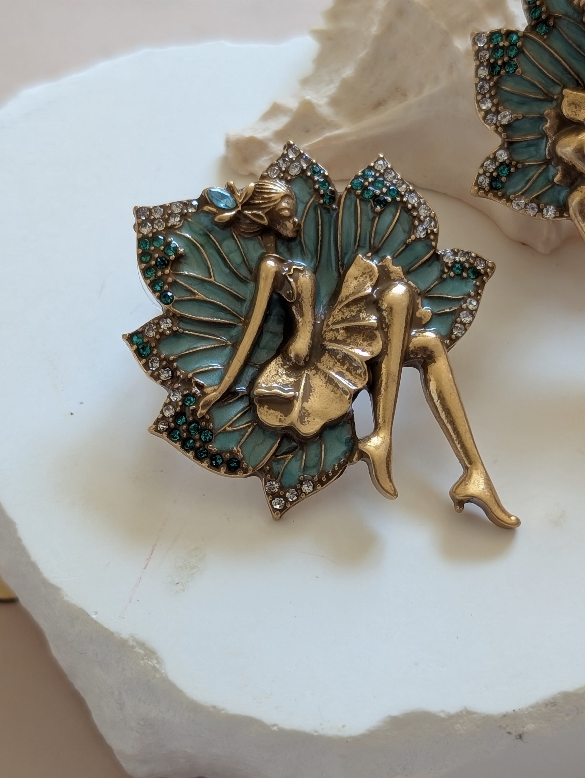 Step into an enchanted garden with the “Whimsical Faerie Bloom” earring, a beautifully crafted statement piece that captures the delicate charm of a fairy in repose. Featuring a gold-toned figure nestled gracefully against intricate, teal enamel wings shaped like a blooming petal, this design is accented with shimmering crystals in emerald green and clear tones. The fine detailing—from the fairy’s poised silhouette to the sparkling accents—evokes a magical elegance, perfect for those who embrace fantasy, femininity, and bold style.