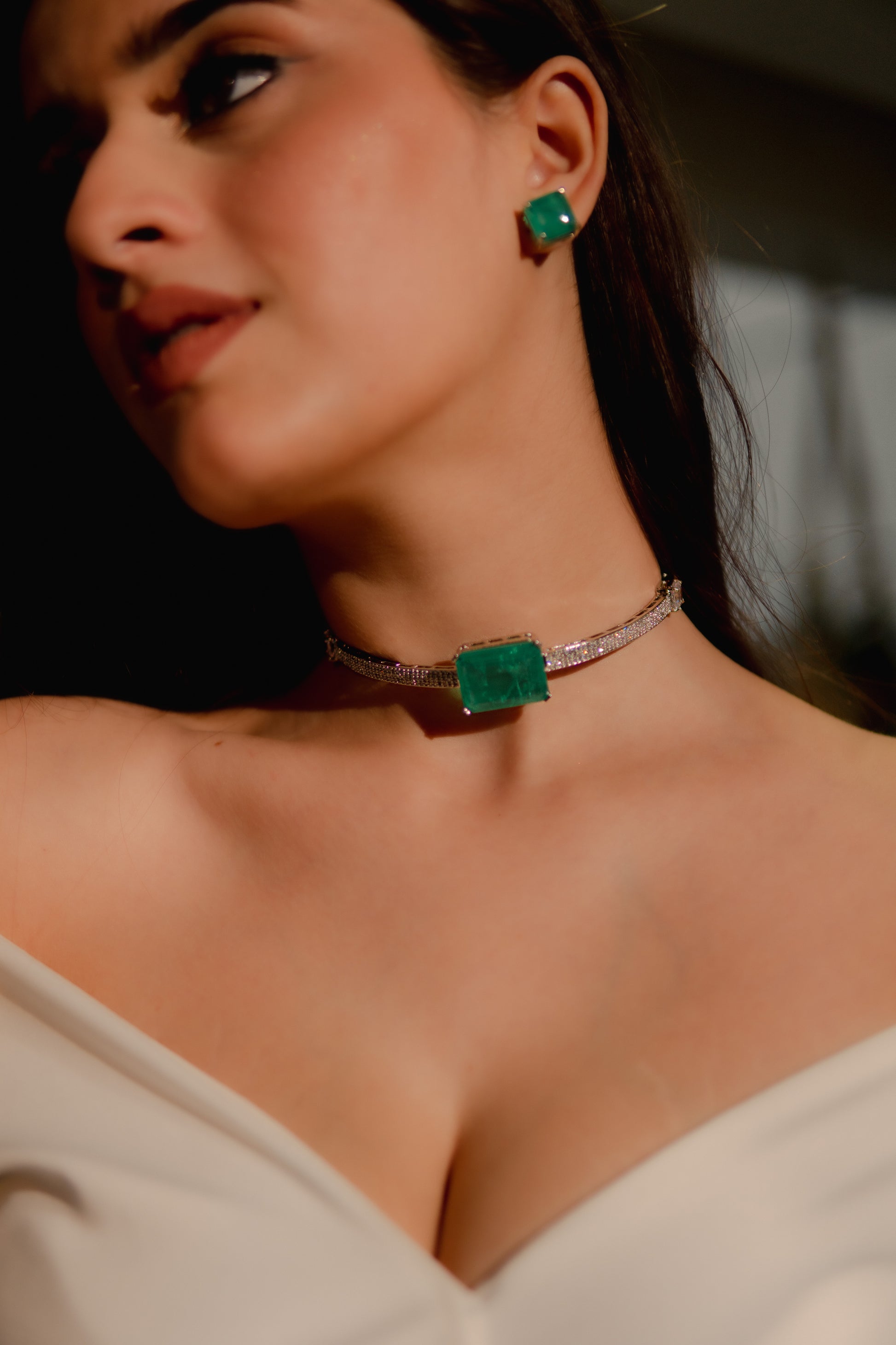 Simplicity meets majestic strength in this emerald-centered choker set. A vivid rectangular gem sits confidently at the heart of the necklace, balanced on a band of encrusted brilliance. The coordinating studs mirror its clarity and richness, making it an ensemble that radiates quiet power. Designed for those who favor less ornamentation but desire a commanding presence, it pairs beautifully with structured gowns or minimal ethnic attire.